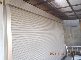 シャッターはリクシルのリフォームシャッター手動タイプ、BOXはS型、アルミ手摺はOCJの縦格子型、