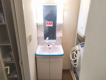 洗面化粧台は同じくリクシルのオフト、間口600㎜、シングルレバー洗髪シャワー水栓です。